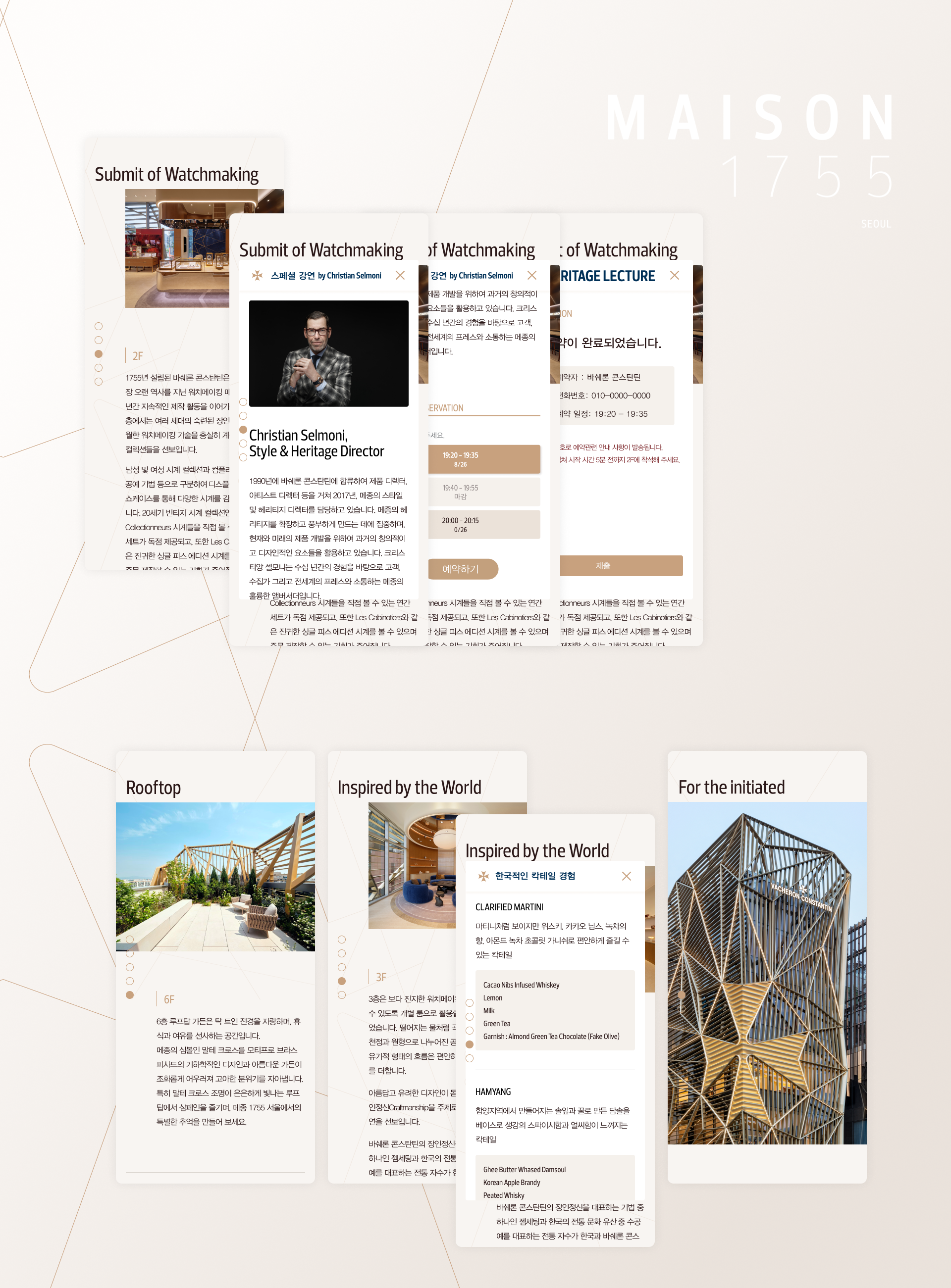 어나더선데이는 '메종 1755 서울' 오픈을 기념하는 VIP 행사를 위해, 리플렛을 대신할 마이크로사이트를 제작하였습니다. 본 사이트를 통해 각 층별 컨텐츠와 구성을 효과적으로 소개하고, 스타일 & 헤리티지 디렉터 크리스티앙 셀모니(Christian Selmoni)의 특별 헤리티지 렉처 예약 및 알림 서비스도 제공하였습니다.