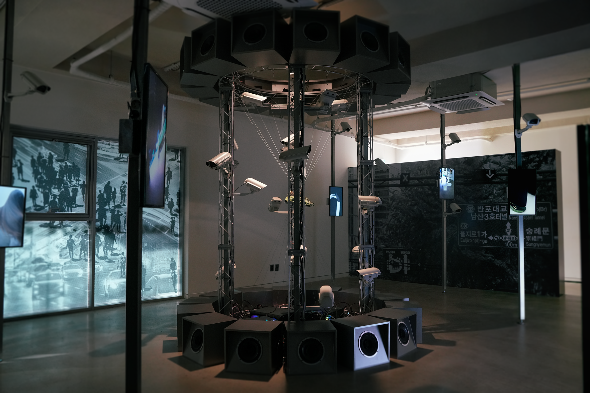 또한 건물 내부에 CCTV를 활용한 미디어 인스톨레이션을 설치해 실시간으로 수집되는 CCTV 이미지를 활용한 연출을 선보였으며, 전시 스케줄에 따라 자동으로 영상이 교체되는 시스템과 전체 콘텐츠의 송출·제어를 담당하는 통합 솔루션을 제공하였습니다.